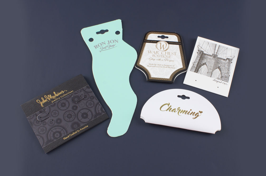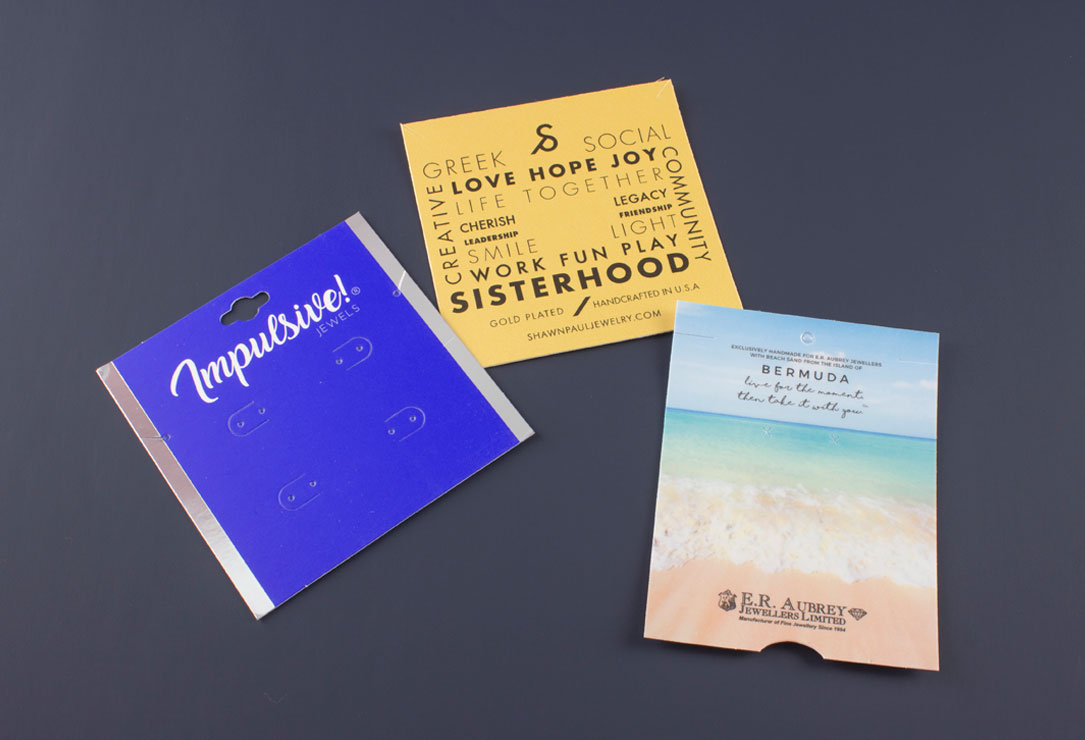Plastic or paperboard, hot stamped or printed, the choices are endless. First Card Packaging has 1000’s of tools available for all types of jewelry whether it is earrings, rings, bracelets, necklaces or other items. Let our Customer Service and Sales teams design the perfect card for your product.
